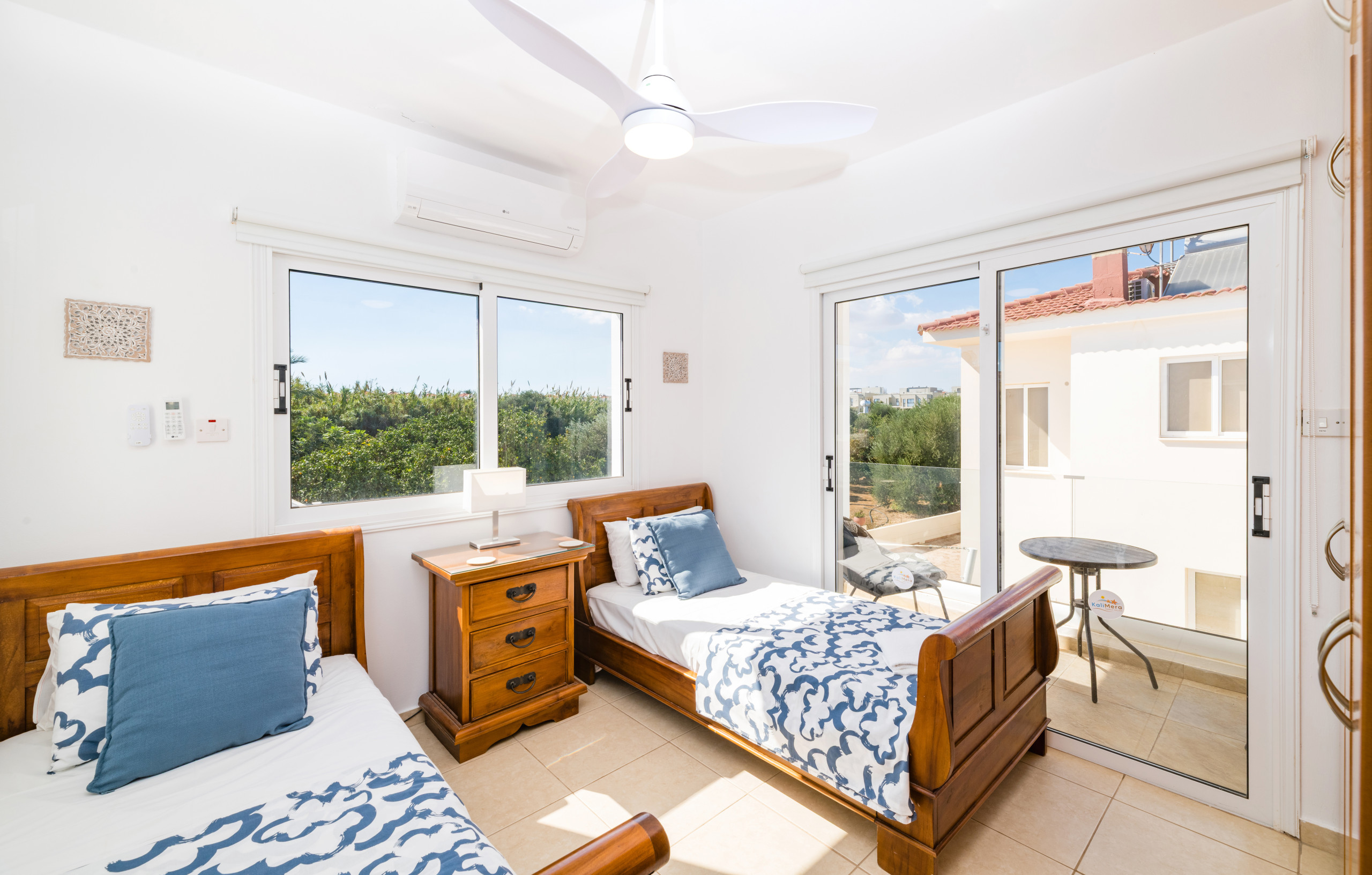 À l'étage, la villa dispose de 2 chambres lits jumeaux avec stores occultants. Les deux chambres partagent l'accès à une salle de bains familiale, avec un balcon commun qui surplombe la piscine privée pour profiter de nuits reposantes et venteuses.