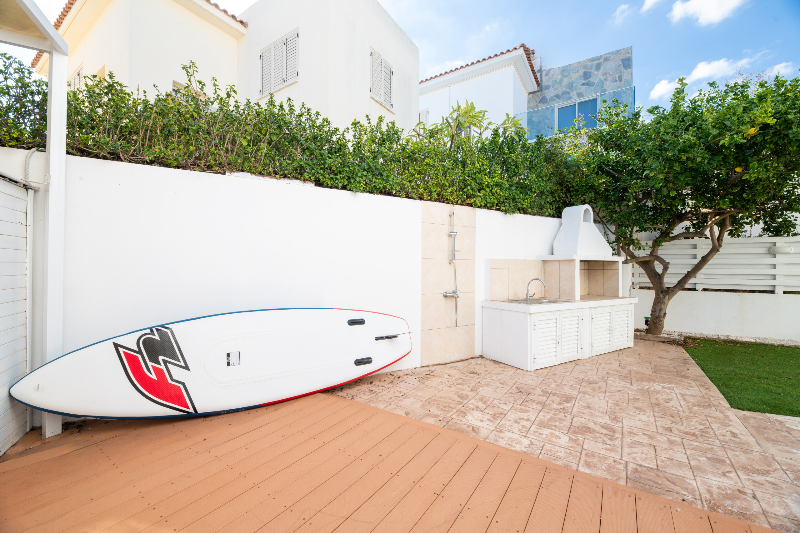 Grâce à ses volets et à son jardin clôturé, la villa offre un bon niveau d’intimité et de sécurité pour les enfants. La piscine privée est entourée de transats, d’un salon de jardin et d’un barbecue traditionnel chypriote, le tout dans un cadre verdoyant.