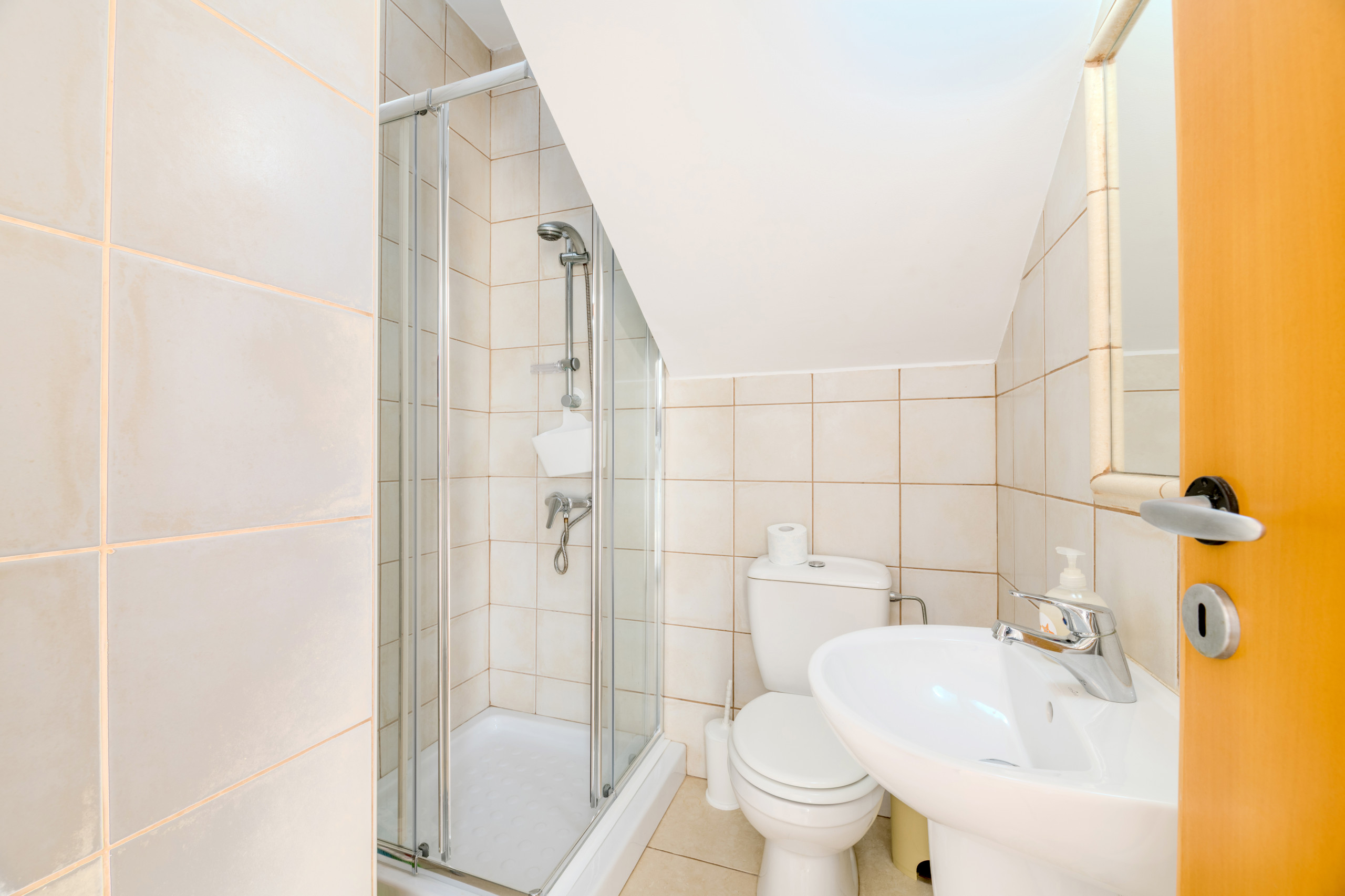 The villa features three cozy bedrooms designed for restful nights after days spent by the sea. The master bedroom includes a double bed, while the remaining two bedrooms each offer twin single beds, comfortably accommodating up to six guests. There are also two modern bathrooms for added convenience. Large patio doors open directly to the outdoor area, where a private swimming pool surrounded by sun loungers invites you to unwind under the Mediterranean sun, while the covered terrace provides a shaded setting for al fresco dining or morning coffee.