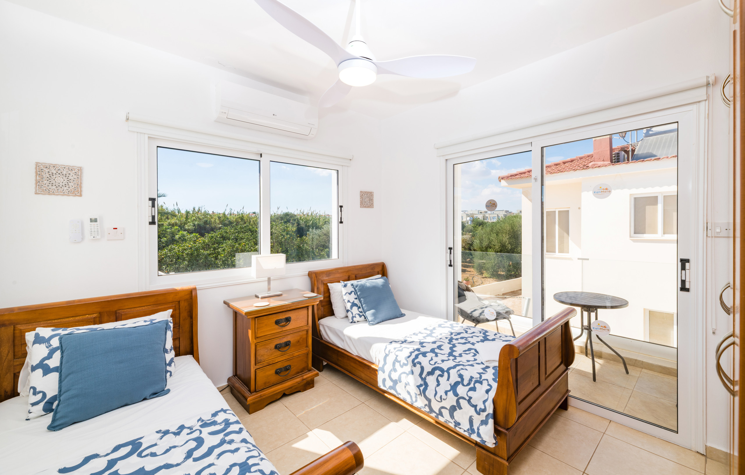 Leading upstairs the villa features 2 twin bedrooms with black-out blinds. Both rooms share access to a family bathroom, with a shared balcony that overlooks the private swimming pool to enjoy relaxing breezy nights.
