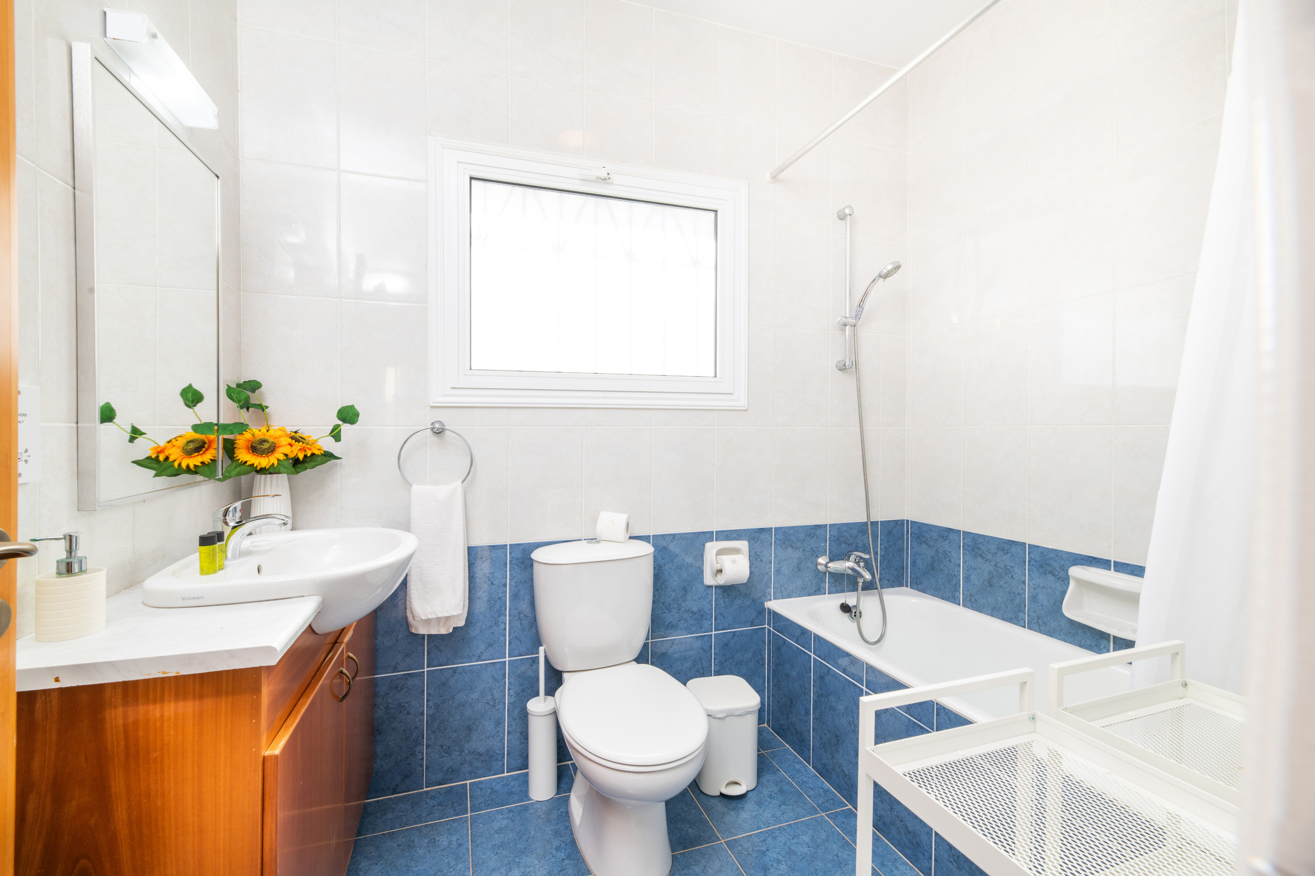 Blue Horizon Villa accommodates up to five guests, featuring two well-appointed bedrooms: a main double bedroom and a second bedroom with two single beds. The villa offers two communal bathrooms for convenience, with one located on the ground floor and the second on the upper level. Both are easily accessible to all guests, ensuring comfort throughout your stay. All rooms are air-conditioned, providing a cool and restful environment after a day in the Mediterranean sun.